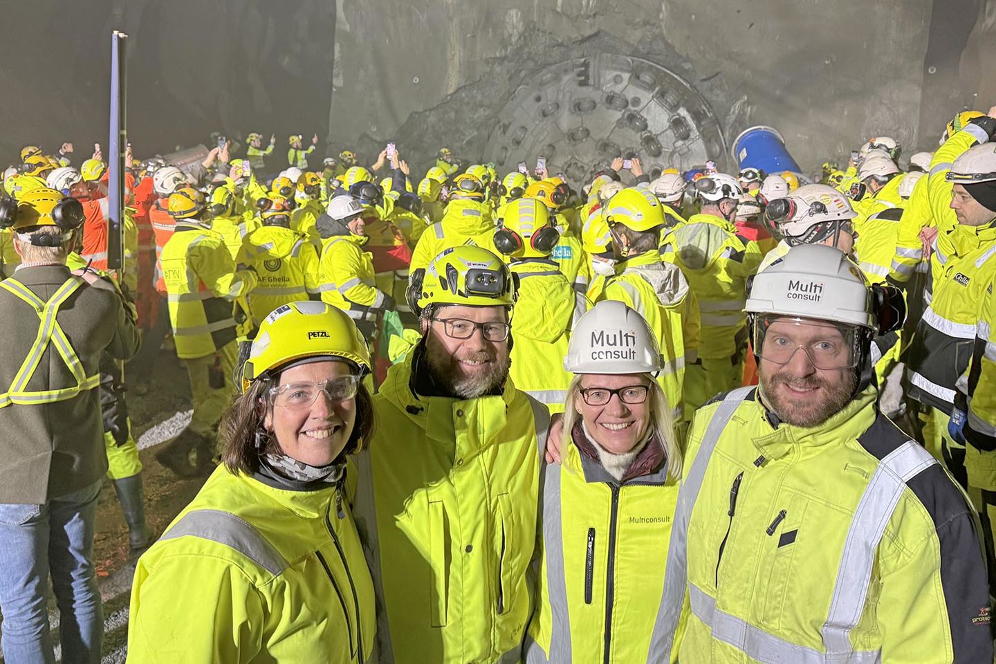 Fire sentrale personer fra Multiconsult var invitert for å se tunellboremaskinen Laila bore de siste meterne inn i TBM-hallen på Huseby.