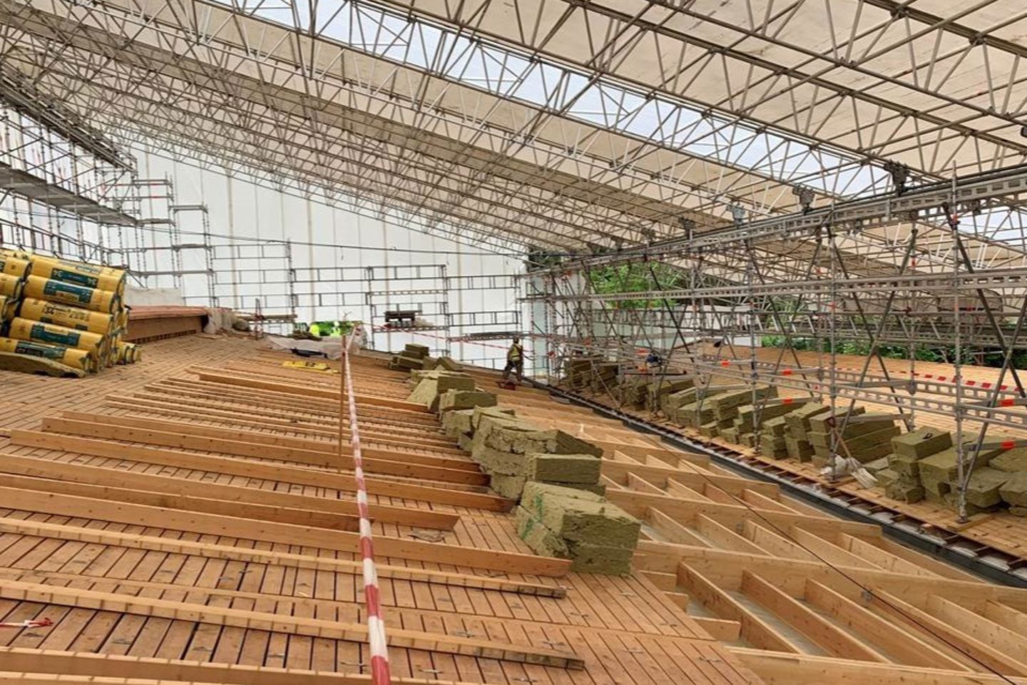 Rehabiliteringen omfattet riving ned til dampsperren, etterfulgt av grundige undersøkelser for å sikre at dampsperren var tett. Deretter ble taket bygget opp igjen med tilleggsisolering og forbedret lufting.